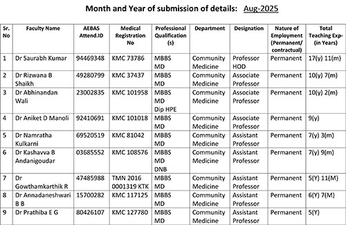 Community Medicine (Preventive and Social medicine) is a branch of medicine that deals with the preventive, promotive, curative and rehabilitative aspects of diseases in the community. The objective of this department is to provide a high quality training in Community Medicine by providing Competency Based Medical Education to the under graduate students enrolled in the MBBS program to create a health care professional who is globally relevant.